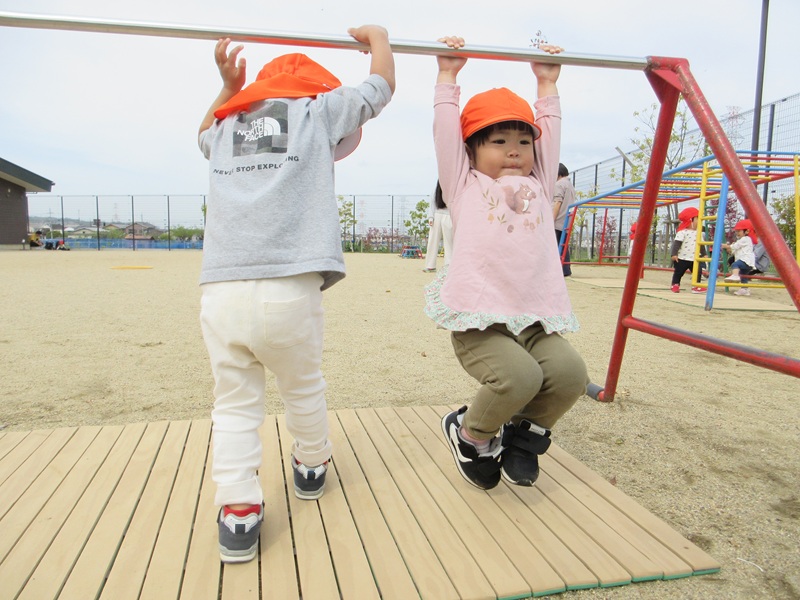 - グラウンドの鉄棒では「もう一回やってみる~」「みてみて~」とお友だちとお話しして繰り返し楽しむ姿がありました!