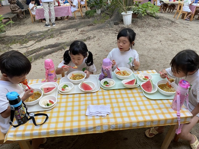 カップに砂を入れてケーキを作ったり、フライパンの中に砂を入れてジュージュー!と焼いたりして園庭での遊びをたのしんでいました!