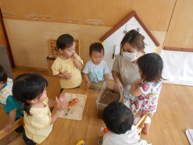 赤・黄・青の色水を作り、色が混ざるときれいな色になり「ジュース!」と言って楽しんでいましたよ☆