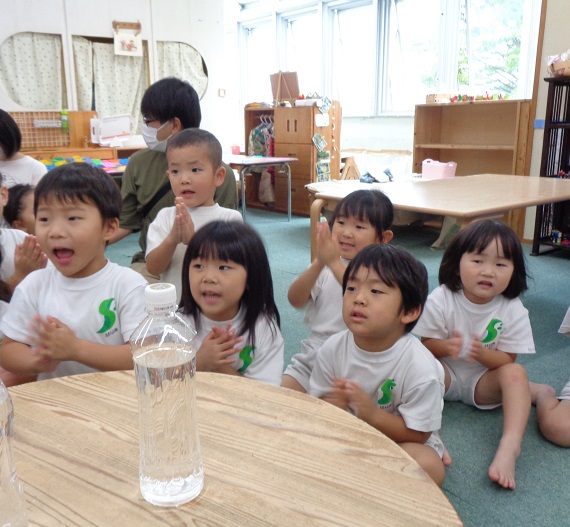 ペットボトルの水の中に絵の具を入れ色が変わるのを夢中で見ていた子どもたち♪