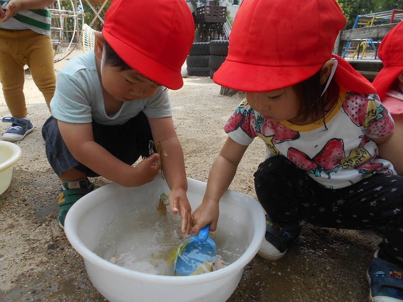 見つけるとお友達に知らせ、一緒に観察したり触ってみたりして