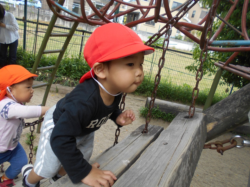 運動遊びが終わって園庭での遊びでも、「ぼく(わたし)の方がいっぱいできるよ!」と雲梯にたくさんぶら下がって出来たことをみんなで喜び合っていました♪