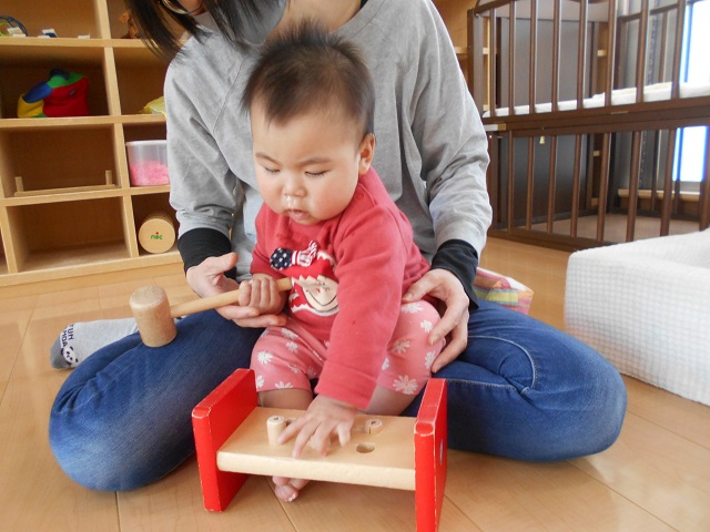 大きな紙にタンポでポンポン・・・ピンクや紫のきれいな色が紙に付くと”ニコッ!”と笑顔の子ども達。