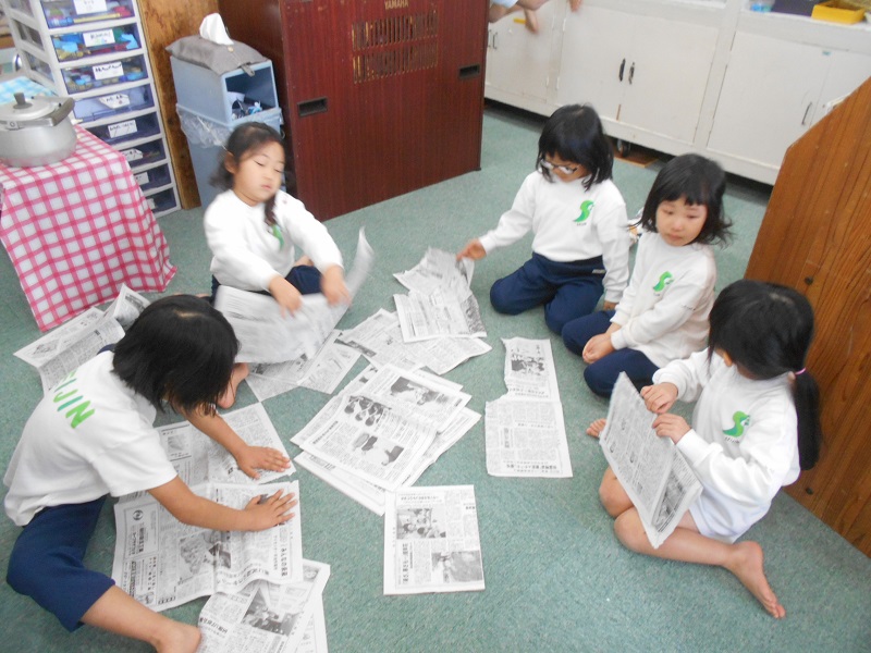- 今日は桃組さんを梅組さんの部屋に招き、折り紙を楽しみました。
