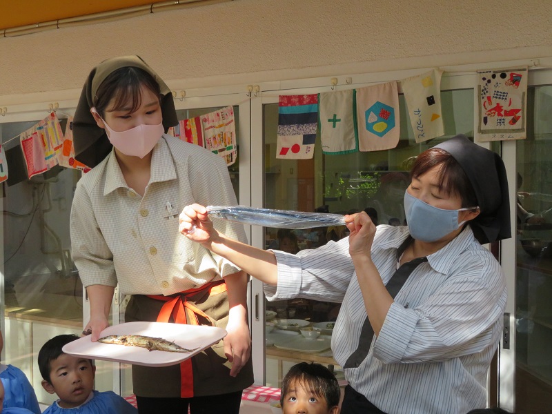 中庭で焼き上げた鰯は格別です。鰯の骨に苦戦しつつも美味しく食べることができましたよ。