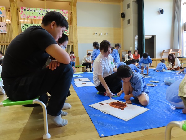 大きな紙に描くのは、最初は戸惑ってましたが、描き始めると「こっち描くな♪」「一緒に塗ろ!」「個々の色は何色にする?」と協力してどんどん進めていましたよ。