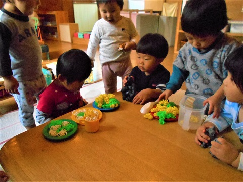 - 午前中は3歳児が4歳児におりがみでおさいふの作り方を教えてもらいました。できたおさいふの中にチケットを入れ、午後からはおやつやさんに参加して楽しみました、5歳児はおやつやさんに飾るおみせの看板や輪つなぎを作り、かわいいおみせに!「いらっしゃいませ」優しくおみせに迎え入れみたらし団子、ポップコーン、ゆずジュースとおいしくいただきました