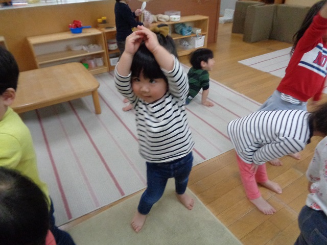 楽器をもっての合奏でも、前に立つ担任を見ながら一生懸命真似をして、リズムを叩いていました☆