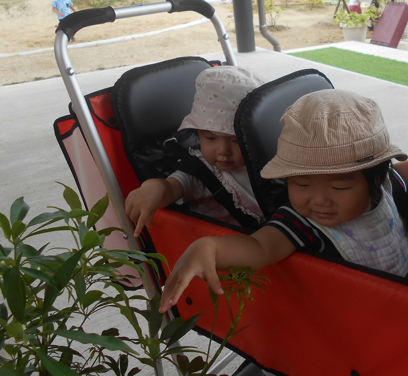 バギーから降りるとハイハイやひとり歩きで探索したり、砂場で遊んだりと思い思いに園庭のお散歩を楽しみました♪