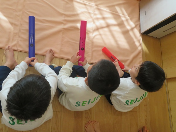 ブームワッカーという筒状で、叩いて音を鳴らす楽器に触れました。カラフルな見た目に子どもたちも興味津々。床に叩いてポンポン、という音を鳴らして楽しみました♪