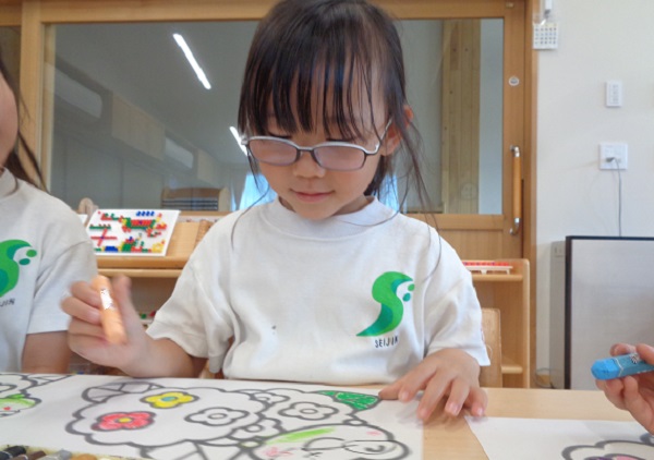 「ここチョウチョみたい」「ここは亀の甲羅に見える」といろいろな形を見つけながら色を塗っていましたよ。