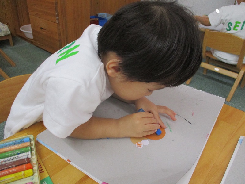 つい最近、園庭でかたつむりを見つけてみんなでみていたのでそのことを思い出しながらクレヨンで描いてくれていましたよ♪クレヨンでぐるぐると渦巻きを描くことを楽しみながら、色も黒で描く子もいれば、青で描く子もいたり、個性があふれるかたつむりが完成しました!