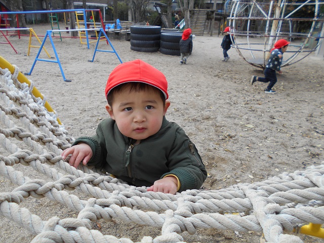 様々な遊具にも興味津々で、お友達が網たいこ橋を頑張って登っているのを見て一緒に登っていました♪