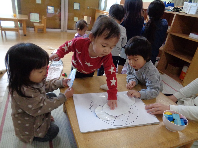 - 以前、吹き抜けのお雛様を見に行って、とっても興味の湧いた様子の子どもたちだったので、今日はお雛様の製作をしました。画用紙にマーカーを使って着物の模様を描きます。ぐるぐると動かしたり、左右にギザギザと描いたり、思い思いのマーカーを走らせて楽しんでいました!お顔を貼るのも、両面テープを自分ではがし、ペタっと上手に貼っていましたよ♪また、指先もどんどん器用になってきていて、2歳児さんから借りたペグさしは集中してたくさん、さして楽しんでいます☆
