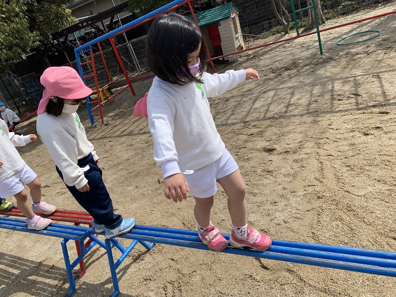 - 今日は戸外で遊んだ後、平均台を渡ってからお部屋に帰りました。