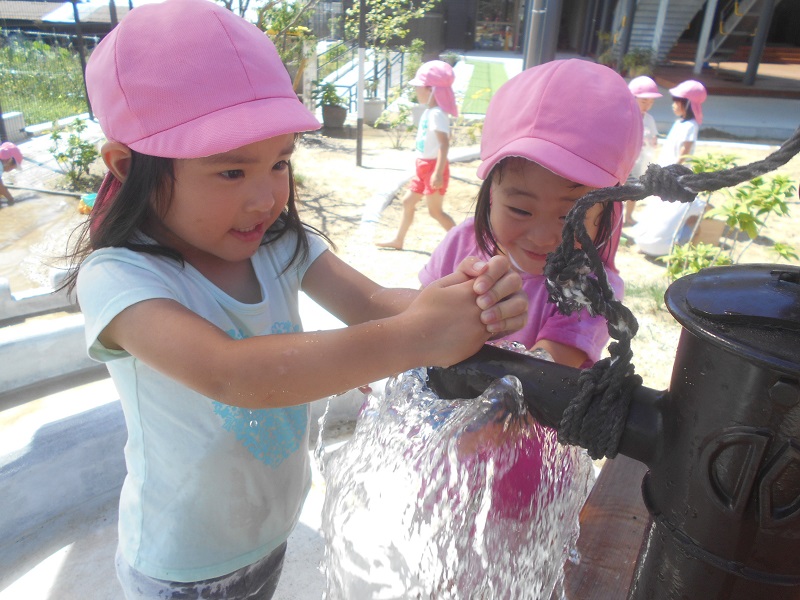 - 水遊び日和????大人気のガチャポンプでは、お友だちと順番に交代しながら水を出し、思いっきり楽しんでいました♬