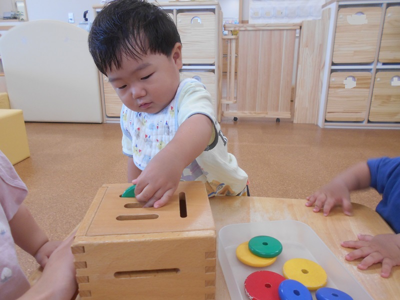 - いちご組のお部屋では、棒落としやスリットBOXなど指先を使って遊ぶ玩具がたくさんあります。