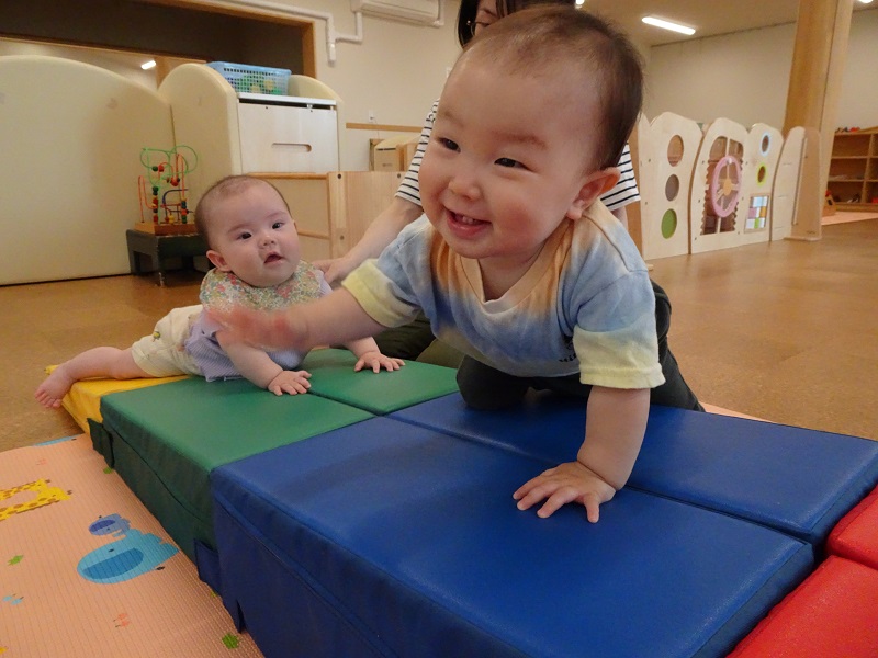 ボールを両手で大切に抱えている子や保育者や囲いの外に向けて上手にボールを投げている子、傾斜マットからコロコロと転がして遊んでいる子、皆それぞれ楽しみ方を見つけていましたよ♪